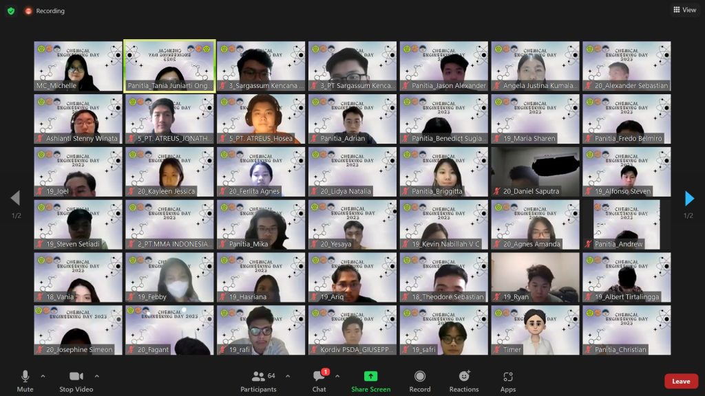 Pada Sabtu (28/01/23), Himpunan Mahasiswa Program Studi Teknik Kimia Universitas Katolik Parahyangan (HMPSTK UNPAR) mengadakan kegiatan Chemical Engineering Day 2023 secara daring. Kegiatan ini bertujuan sebagai bentuk apresiasi serta wadah bagi mahasiswa/i Teknik Kimia tingkat akhir untuk menampilkan hasil perancangan pabrik. Adapun dewan juri yang dihadirkan dalam kegiatan CED 2023, yaitu Ashianti Stenny Winata, S.T., M.T., dan Dr. Angela Justina Kumalaputri.
