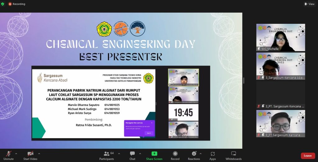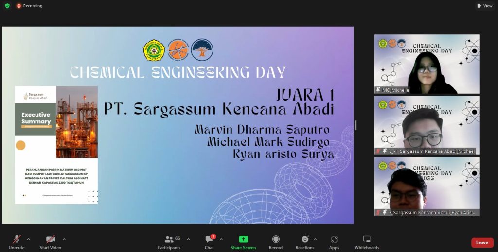 - Best Presenter: PT Sargassum Kencana Abadi — “Perancangan Pabrik Natrium Alginat dari Rumput Laut Coklat Sargassum sp. Menggunakan Proses Calcium Alginate dengan Kapasitas 2.200 ton/tahun”