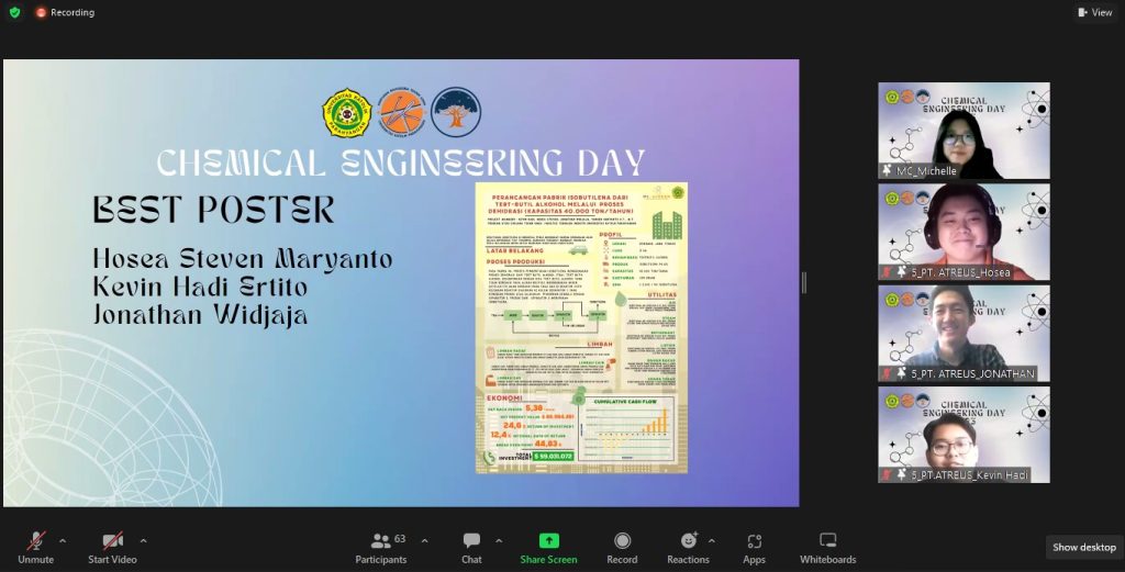 - Best Poster: PT Atreus — “Perancangan Pabrik Isobutilena dari Tert Butil Alkohol dengan Proses Dehidrasi dengan Kapasitas 40.000 ton/tahun”