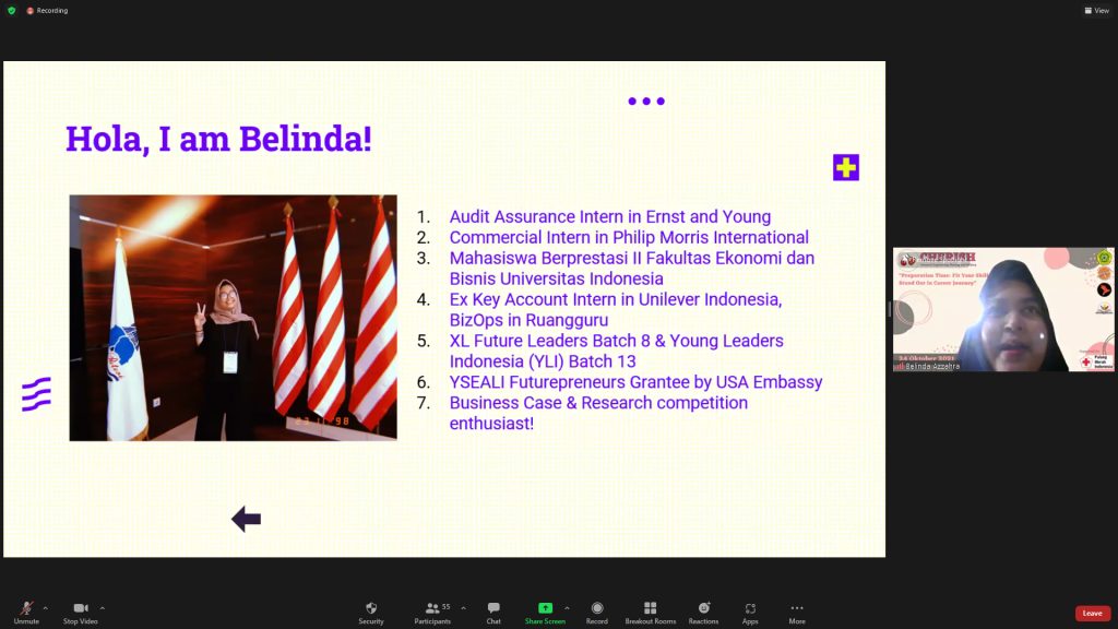 Sesi pertama oleh Belinda membahas mengenai “outstanding” yang berarti keseimbangan antara softskill dan hardskill, serta dalam realisasinya setiap individu diharapkan mempunyai suatu tujuan dalam melakukan sesuatu dan tidak hanya sekedar ikut-ikutan. “Dalam persiapan karir diperlukan penentuan end goals serta beberapa tahap lainnya seperti persiapan, trial and error, steady, dan new challenges”, tutur Belinda. Pada tahap persiapan diperlukan penentuan prioritas atau goals yang akan membantu kita mencapai end goals. Tahap selanjutnya yaitu trial and error mengharuskan kita untuk mencoba semua sektor baik itu dari segi lomba, segi organisasi, yang hasil akhirnya menentukan branding diri kita. Setelah itu, tahap steady menjadi tahap untuk mendalami hal-hal yang sudah diputuskan untuk menjadi cerminan atau branding diri. Tahap terakhir, yaitu tahap new challenges menjadi tahap untuk memutuskan apakah ingin mencoba hal-hal baru atau tetap berada pada tahap steady dengan kata lain zona nyaman. Belinda juga memaparkan bahwa saat ini networking merupakan salah satu hal yang penting dalam menata karir sehingga tidak bisa hanya berpacu dengan IPK.