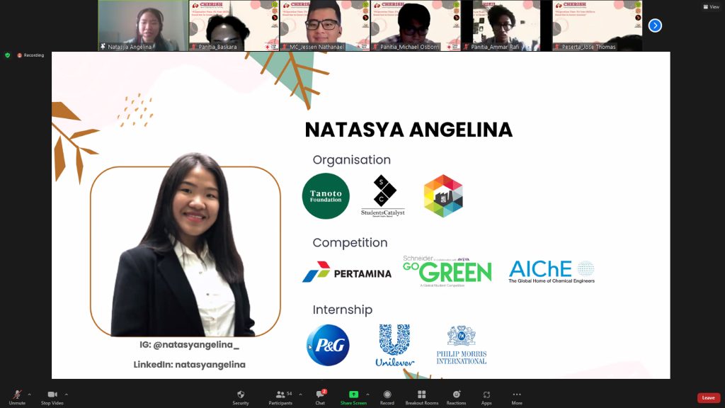 Sesi kedua dari pre-event CHERISH 2021 dibawakan oleh Natasya Angelina yang membahas pengalaman-pengalaman organisasi, internship, dan lomba-lomba yang diikuti selama perkuliahan. Natasya menjelaskan pentingnya aktif dan ikut ambil bagian baik dalam organisasi maupun bidang lainnya seperti lomba dengan tujuan untuk mengetahui goals, meningkatkan kemampuan leadership, public speaking skill dan networkings, serta mengikuti internship untuk menambah pengalaman kerja. Menurut Natasya, dalam menambah pengalaman, baik organisasi maupun internship, dapat dikembangkan dengan metode Individual Development Goals dan juga Kaizen.