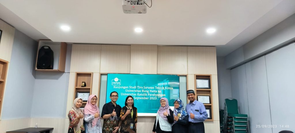 Pada hari Senin, 25 September 2023, Jurusan Teknik Kimia Unpar menerima kunjungan studi tiru dari Jurusan Teknik Kimia, Universitas Bung Hatta, Padang. Kunjungan diterima oleh Dekan FTI beserta jajarannya dan juga Kajur Teknik Kimia Unpar, beserta jajarannya. Sementara itu, tim dari Universitas Bung Hatta dipimpin oleh Prof. Reni Desmiarti (Dekan FTI) dan Dr. Firdaus (Kajur Teknik Kimia).