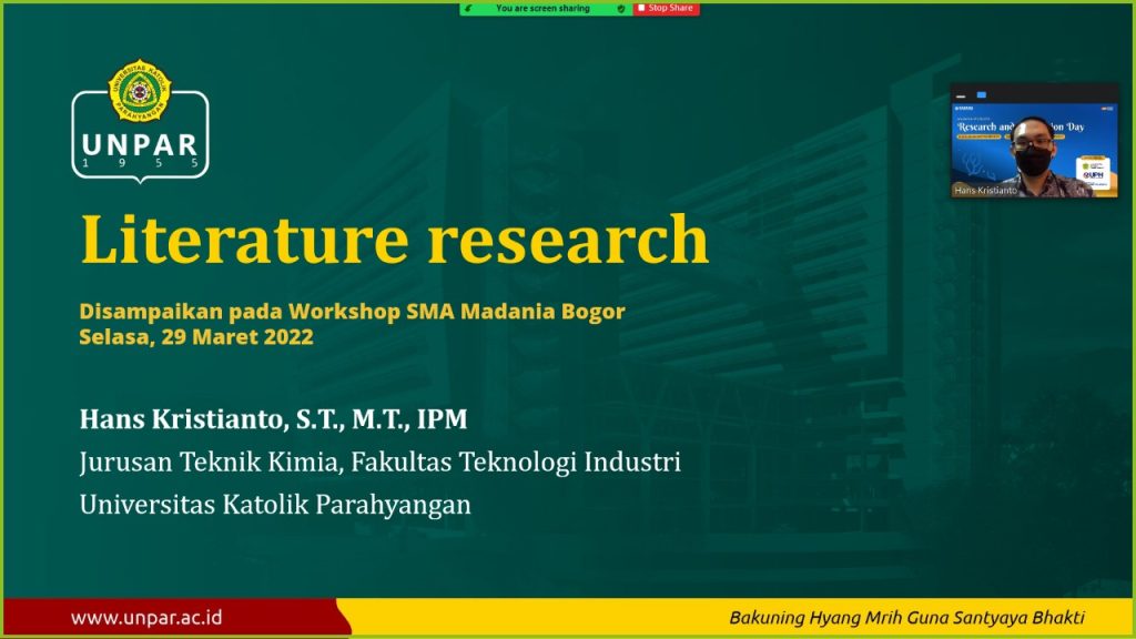 Pada 29/03/22, salah seorang dosen TK UNPAR, yaitu Hans Kristianto, S.T., M.T. menjadi narasumber dalam workshop Literature Research. Acara workshop ini diadakan secara daring oleh SMA Madania Bogor. Peserta workshop ini adalah siswa kelas 10 SMA tersebut dengan tujuan untuk mengenalkan ilmu kepustakaan, mulai dari studi pustaka, langkah-langkah pengerjaan, sumber pustaka, dan tips menulis. Ilmu yang diberikan ini diharapkan dapat bermanfaat untuk pengerjaan proyek tugas akhir siswa yang dikerjakan berjenjang dari kelas 10 sampai 12.
