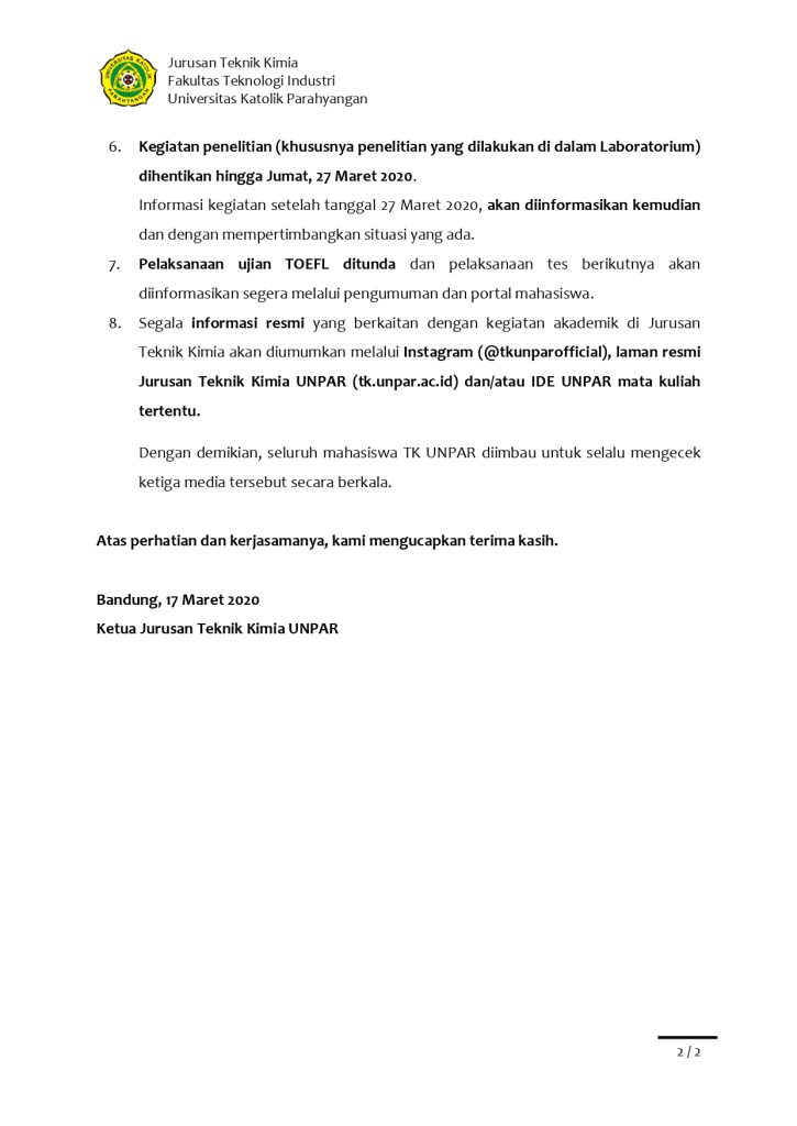 [PENGUMUMAN] Tindak Lanjut Jurusan Teknik Kimia terkait Upaya Pencegahan Infeksi COVID-19 di Lingkungan UNPAR