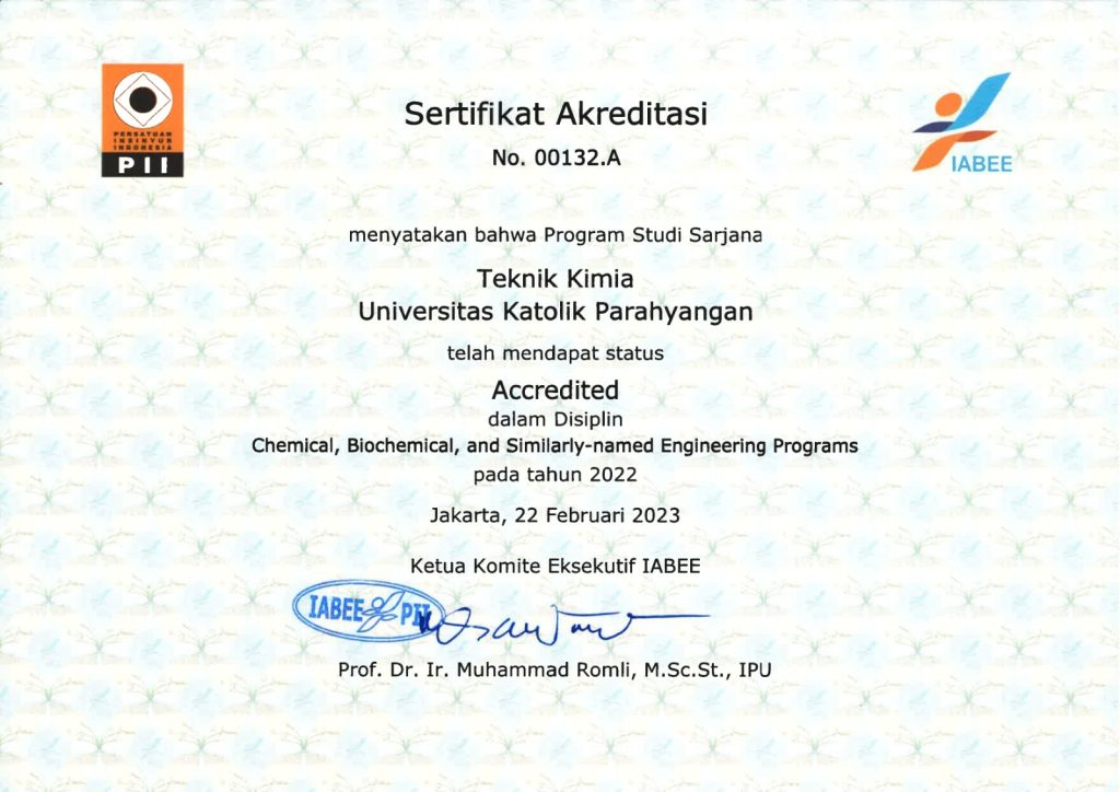 Program Studi (Prodi) Sarjana Teknik Kimia Universitas Katolik Parahyangan (UNPAR) berhasil memperoleh status akreditasi internasional (general accreditation) dari Indonesian Accreditation Board for Engineering Education (IABEE) di mana sebelumnya, prodi tersebut memperoleh akreditasi Unggul dari BAN-PT pada tahun 2020. Penetapan ini didasarkan pada sertifikat akreditasi No. 00132.A yang diumumkan oleh IABEE pada awal Maret 2023. Raihan ini merupakan suatu prestasi mengingat Prodi Sarjana Teknik Kimia UNPAR merupakan prodi teknik kimia PTS pertama yang memperoleh status akreditasi tersebut di Jawa Barat-Banten, dan PTS kedua di Indonesia yang meraih predikat tersebut.