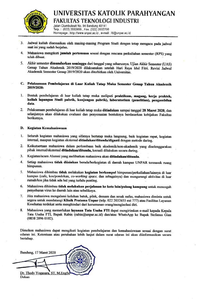 [SURAT EDARAN] Tindak Lanjut Upaya Pencegahan Penyebaran Infeksi COVID-19 di Lingkungan FTI UNPAR