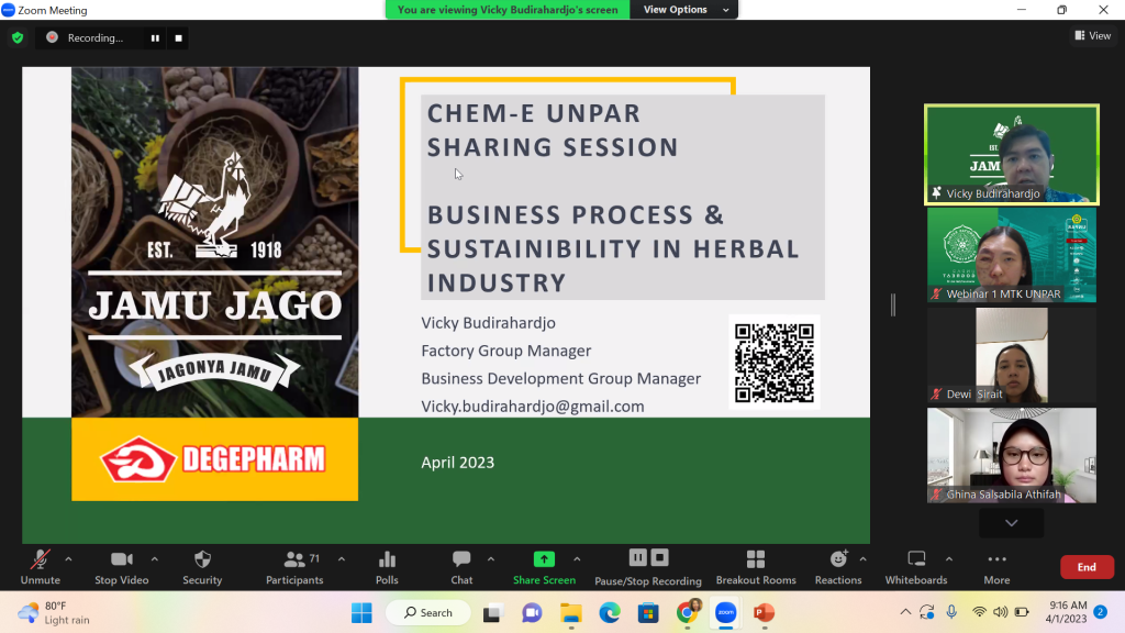 Pada Sabtu (01/04/23), Jurusan Teknik Kimia (TK) UNPAR mengadakan webinar Magister Teknik Kimia 1. Webinar kali ini mengundang Vicky Budirahardjo (TK UNPAR 2000) yang merupakan Factory Group Manager, Business Development Group Manager, dan Brand Manager dari PT DJAGO (Jamu Jago) dan PT DASA GAYA (Degepharm). Webinar ini mengambil topik tentang “Industri Herbal: Processes & Business Sustainability“. Selain berbagi ilmu dan informasi, pelaksanaan webinar ini merupakan bagian dari bentuk promosi program magister TK UNPAR.